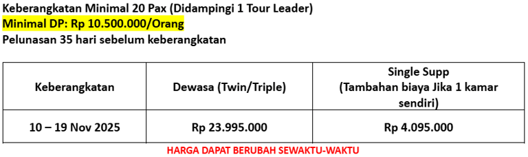 Harga berlaku untuk minimal 25 peserta. Apabila jumlah peserta kurang dari minimum kuota yang tersedia maka Kami berhak untuk melakukan penyesuaian harga ATAU pemindahan tanggal ATAU membatalkan keberangkatan jika tidak ada kesepakatan.