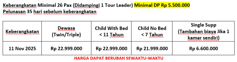 Harga berlaku untuk 26 peserta. Apabila jumlah peserta kurang dari minimum kuota yang tersedia maka Kami berhak untuk melakukan penyesuaian harga atau pemindahan tanggal keberangkatan selanjutnya atau membatalkan keberangkkatan apabila tidak ada kesepakatan bersama.