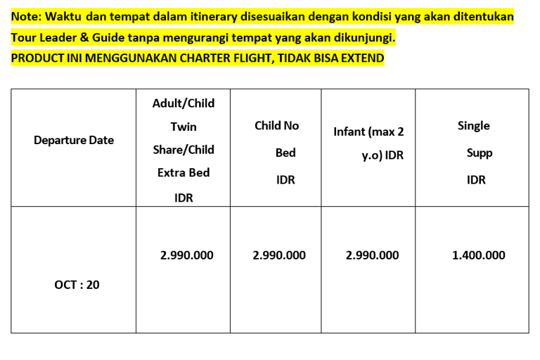 Harga berdasarkan 20 Peserta Dewasa + 1 Tour Leader.