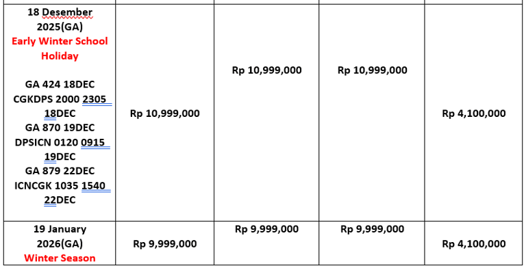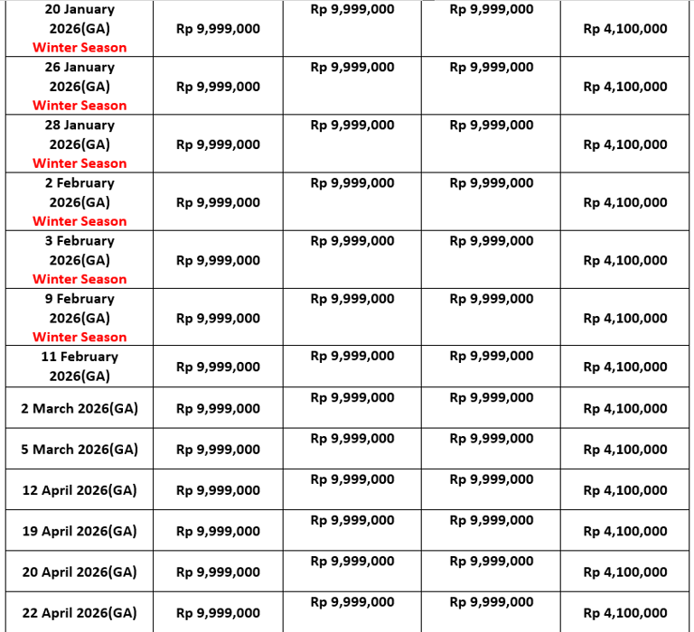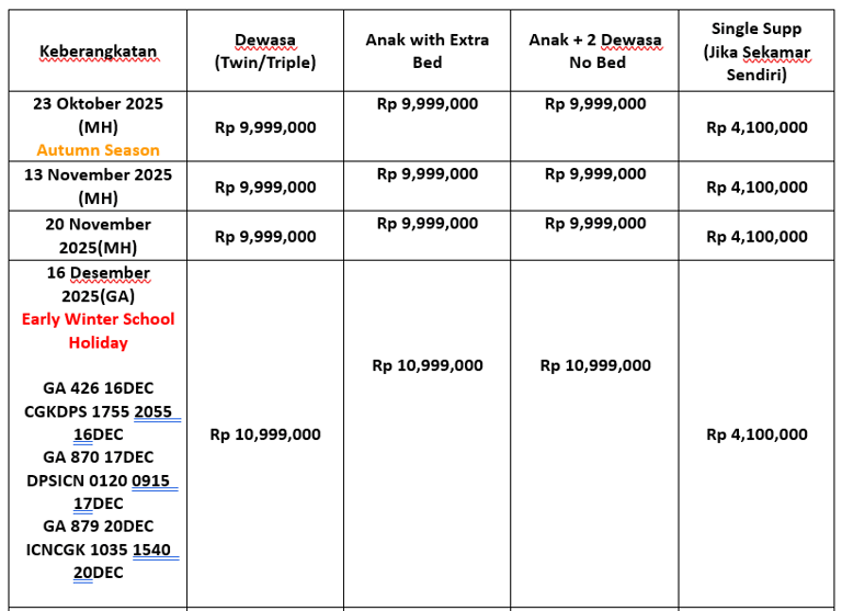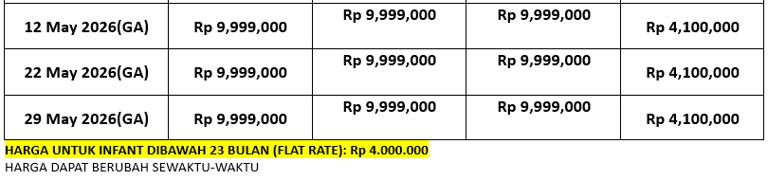 Peak Season: Deposit saat pendaftaran, pelunasan maksimal 25 hari sebelum keberangkatan.