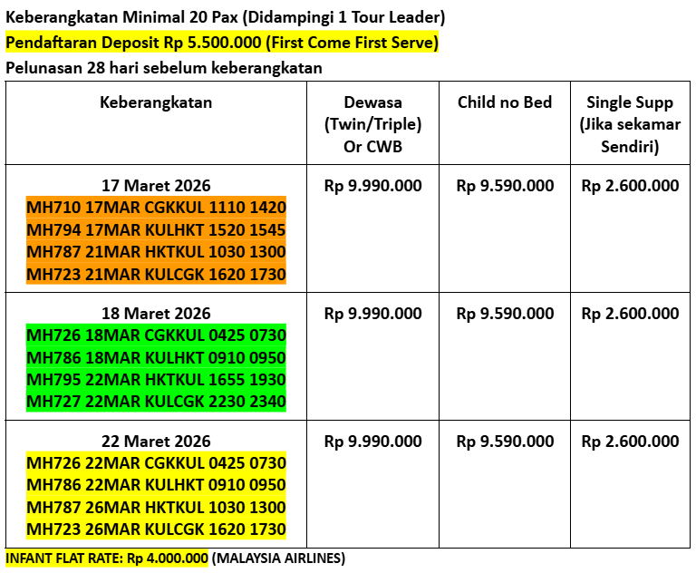 Paket ini sudah termasuk tiket pesawat pulang-pergi dengan Malaysia Airlines, akomodasi hotel bintang 5 yang nyaman, tour leader berpengalaman, transportasi lokal, travel kit eksklusif, serta perlindungan asuransi perjalanan.