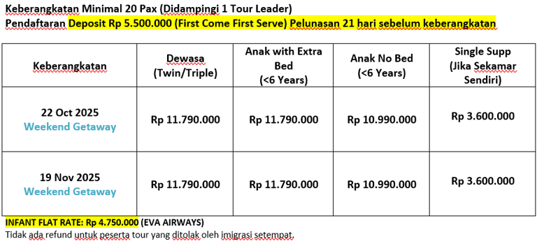 Harga Tour: Harga dasar berlaku setelah deposit, tetapi tax internasional, tipping, dan visa bisa berubah tanpa pemberitahuan.