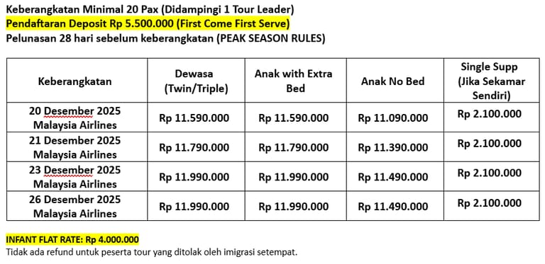 Harga tour kami merupakan harga All in (Termasuk tax international), dengan tarif dasar mengikat apabila tamu sudah deposit, namun tax internasional tidak mengikat.