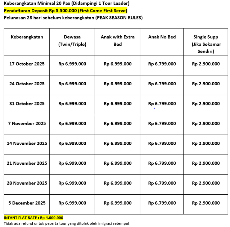 Peak Season: Deposit saat pendaftaran, pelunasan maksimal 25 hari sebelum keberangkatan.