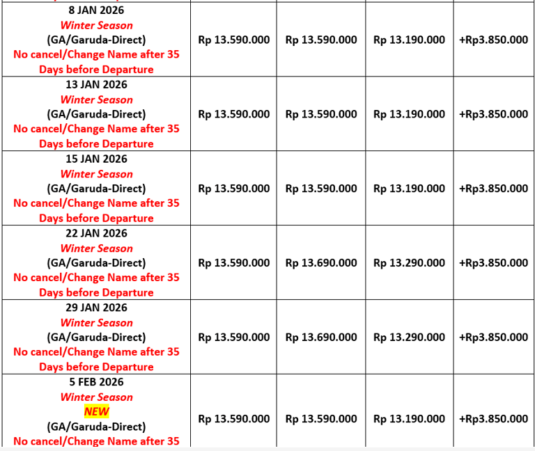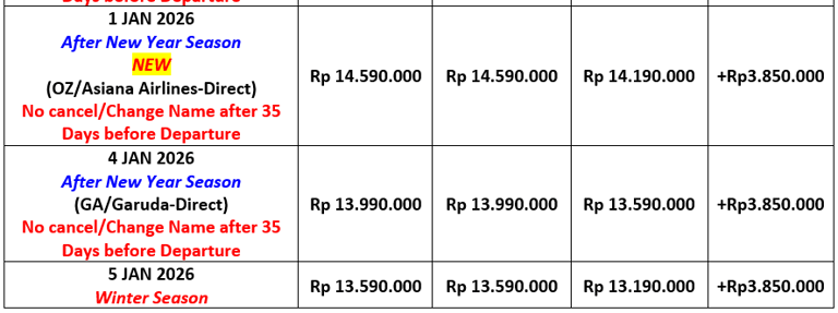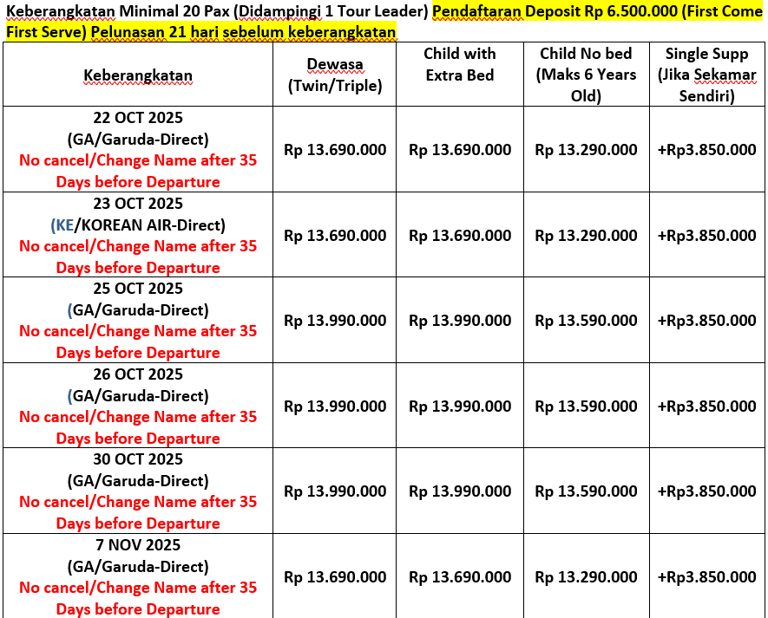 Peak Season: Deposit saat pendaftaran, pelunasan maksimal 25 hari sebelum keberangkatan.