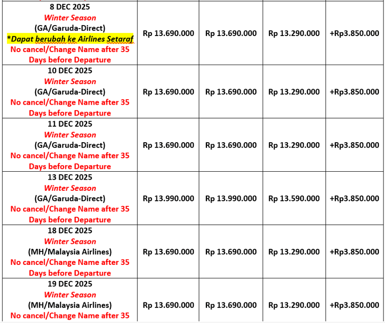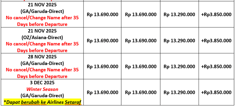 Perubahan Jadwal: Jadwal tour, hotel, dan penerbangan dapat berubah tergantung kenyamanan peserta.