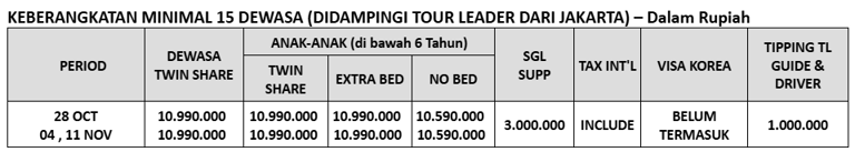 Harga Tour: Harga dasar berlaku setelah deposit, tetapi tax internasional, tipping, dan visa bisa berubah tanpa pemberitahuan.