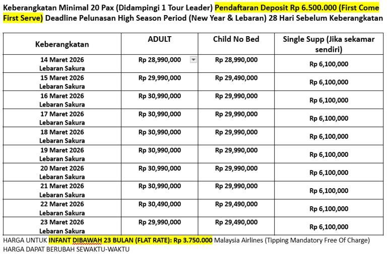 Harga Tour: Harga dasar berlaku setelah deposit, tetapi tax internasional, tipping, dan visa bisa berubah tanpa pemberitahuan.
