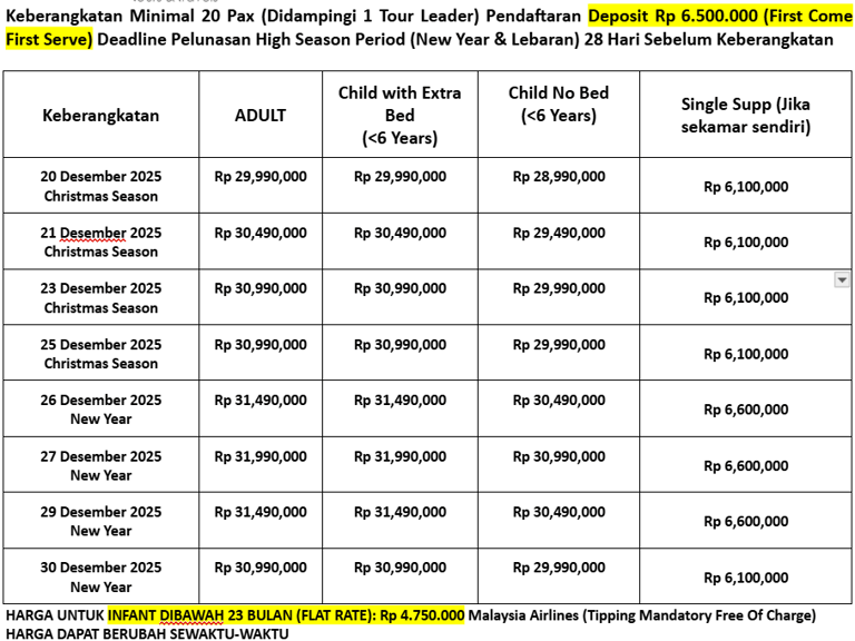 Harga Tour: Harga dasar berlaku setelah deposit, tetapi tax internasional, tipping, dan visa bisa berubah tanpa pemberitahuan.
