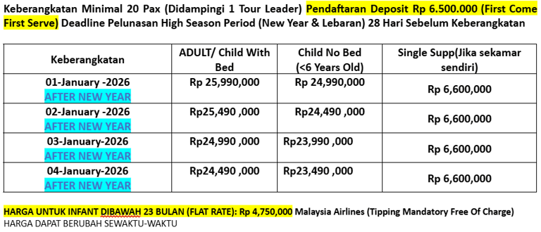 Harga tour kami merupakan harga All in (Termasuk tax international), dengan tarif dasar mengikat apabila tamu sudah deposit, namun tax internasional tidak mengikat.