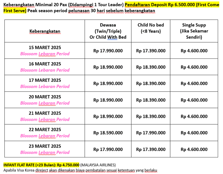 Peak Season: Deposit saat pendaftaran, pelunasan maksimal 25 hari sebelum keberangkatan.