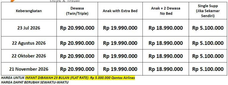 Harga Tour: Harga dasar berlaku setelah deposit, tetapi tax internasional, tipping, dan visa bisa berubah tanpa pemberitahuan.