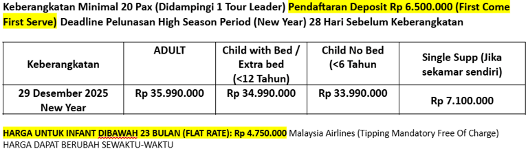 Harga tour kami merupakan harga All in (Termasuk tax international), dengan tarif dasar mengikat apabila tamu sudah deposit, namun tax internasional tidak mengikat.