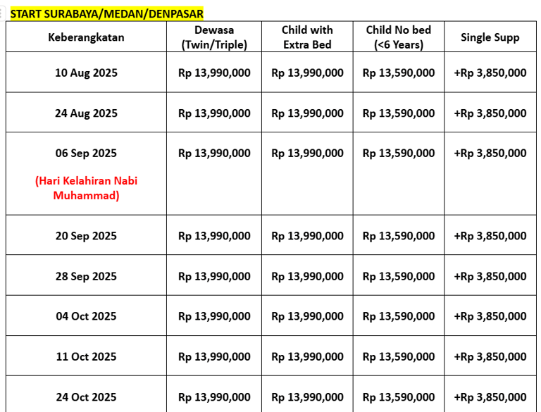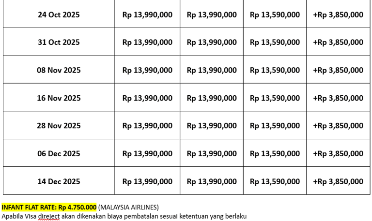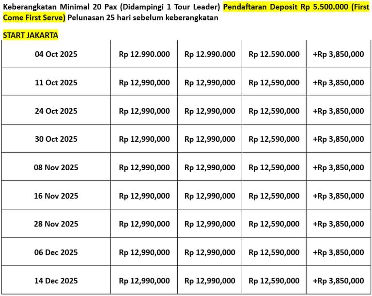 Peak Season: Deposit saat pendaftaran, pelunasan maksimal 25 hari sebelum keberangkatan.