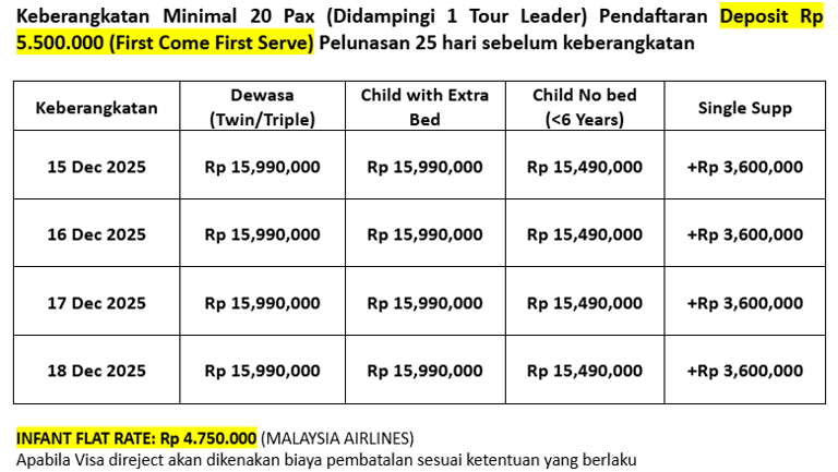 Harga Tour: Harga dasar berlaku setelah deposit, tetapi tax internasional, tipping, dan visa bisa berubah tanpa pemberitahuan.