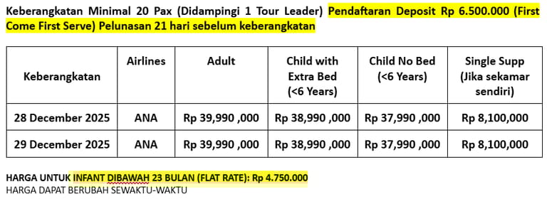 Paket ini telah termasuk tiket pesawat All Nippon Airways (kelas ekonomi, pilih kursi sesuai preferensi warna dan posisi), akomodasi hotel nyaman dengan pilihan tipe kamar (twin/double), transportasi selama tur, asuransi perjalanan, perlengkapan travel (jaket hangat, selempang travel anti-air, dan koper kabin dengan warna favorit tersedia), serta bonus dokumentasi foto profesional.