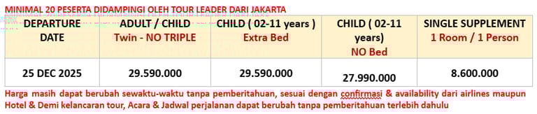 Airport Tax Internasional, Fuel Surcharge, biaya visa dan asuransi perjalanan pribadi dapat berubah sewaktu-waktu, dan akan disesuaikan kepada peserta sebelum keberangkatan.