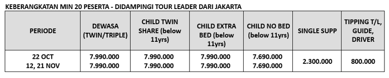 | · Group Visa Korea: Rp 750.000 (Jika dianggap tidak memenuhi syarat, maka akan diarahkan untuk membuat Visa Individual dengan Biaya Visa Individual Rp 1.300.000) *Ketentuan dapat berubah sewaktu-waktu dari kedutaan besar Korea · Tipping Tour Leader, Local Guide, Driver: Rp 950.000/Orang • Tips Porter Hotel, Mini Bar, Laundry, Telp, Kelebihan bagasi dll. • PCR Test / Rapid Test Antigen Jika dibutuhkan