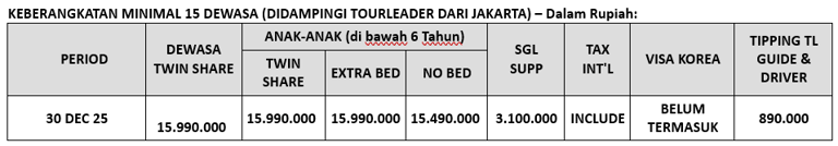 | • Travel Insurance Group (disarankan): Rp 270.000/Orang • Visa Korea Group (jika memenuhi persyaratan): Rp 750.000/Orang • Visa Korea Perorangan: Rp 1.400.000/Orang • Tipping Tour Leader, Local Guide, Driver: Rp 890.000/Orang • Pengurusan Document perjalanan: Passport • Tips Porter Hotel, Mini Bar, Laundry, Telp, dll |