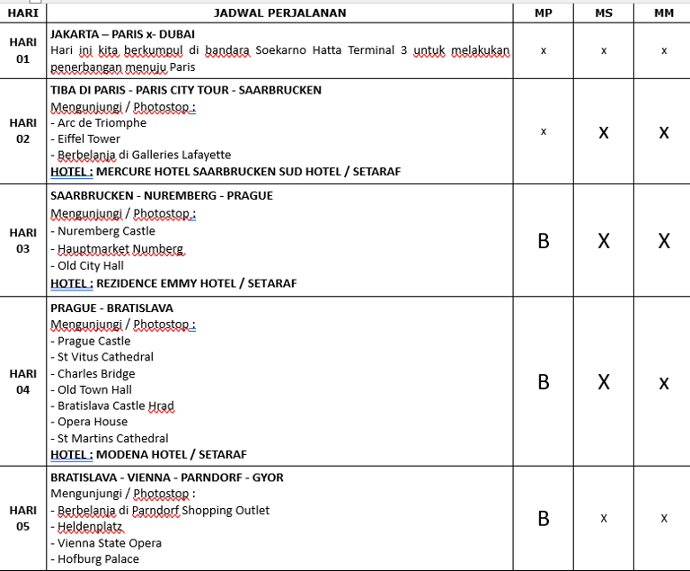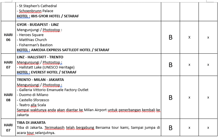 1. Tiket internasional : JAKARTA – PARIS | MILAN – JAKARTA By EMIRATES Economy Class (Non Refundable, Non Re-Routeable, Non Endorsable) 2. Bagasi 30kg sesuai dengan peraturan penerbangan 3. Akomodasi Hotel *3 selama 6 malam ( based on Twin Sharing) Base on Availability & Confirmations in Final Itinerary 4. Transportasi Bus ber AC & Admission Fee objek wisata | 1. Visa Schengen : 3.850.000/Pax (Non Refund) 2. International Taxes & Surcharges : Rp 3.100.000/Pax 3. Tipping TL, driver, City tax : IDR 2.400.000 /Pax 4. Travel Insurance: IDR 700.000 /Pax (Wajib) 5. Pengeluaran pribadi : Laundry, Phone, Minibar, dll 6. Pengurusan dokumen perjalanan : Passpor, Visa, dll 7. Optional Tour 8. Biaya kelebihan bagasi 9. Biaya extend / deviasi Travelling Bag |