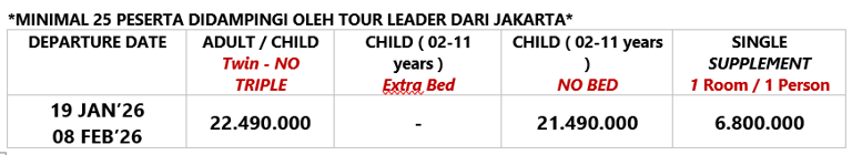 Nikmati pengalaman wisata tak terlupakan bersama Paket Wisata Kelompok dari Jakarta! Paket istimewa ini dirancang khusus untuk rombongan minimal 25 peserta, lengkap dengan tour leader profesional yang berangkat dari Jakarta. Harga paket berlaku untuk dewasa dan anak-anak, dan tersedia pilihan kamar single untuk kenyamanan maksimal. Tersedia juga opsi kamar anak dengan atau tanpa tempat tidur, sehingga fleksibel untuk keluarga atau kelompok dengan anak-anak. Nikmati berbagai fasilitas eksklusif selama perjalanan, itinerary menarik, serta kemudahan dalam penyesuaian kebutuhan kelompok Anda. Hubungi kami sekarang untuk custom itinerary atau tambahan permintaan spesial lainnya!