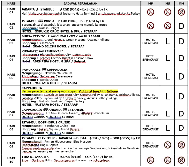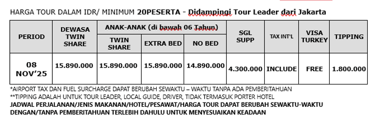 Rasakan petualangan eksklusif selama 10 hari di Turkey dengan paket 'Turkey Dream + Bosphorus Cruise 10D'! Jelajahi misteri Cardak Underground City, nikmati pemandangan menakjubkan di Göreme Valley & Panorama, dan lengkapi perjalanan Anda dengan pengalaman berlayar di Bosphorus Cruise. Paket ini termasuk akomodasi nyaman, transportasi modern, makanan lezat khas Turki, dan panduan profesional. Cocok untuk segala usia dan tersedia dalam beberapa pilihan tanggal untuk fleksibilitas perjalanan Anda.