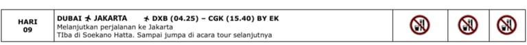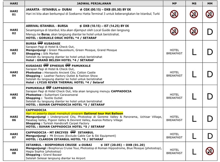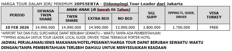 1. Tiket pesawat Internasional pulang pergi & International Taxes by EMIRATES 2. Hotel bertaraf *4/5 selama perjalanan 3. Tour leader yang berpengalaman dari Jakarta 4. 1 Buah bagasi dengan berat maksimum 25 Kg & 1 tas tangan untuk dibawa ke dalam cabin pesawat dengan berat 7 Kg. (Ketentuan bagasi yang diberikan masih dapat berubah kembali sesuai dengan ketentuan yang diberikan oleh pihak Airlines terkait) 5. program makan sesuai dengan itinerary 6. Transportasi Bus Condition (AC) selama perjalanan 7. Luggage Tag 8. Air Mineral 01 botol / pax / day | 1. Biaya pembuatan dokumen perjalanan seperti Paspor, Visa, KITAS, dll. 2. Tips Guide Lokal dan Pengemudi dengan jumlah yang umum & disarankan 3. Travel Insurance (disarankan) Group : Rp 500.000/Pax 4. Pengeluaran pribadi seperti mini bar, phone, room service, laundry & pengeluaran lainnya yang bersifat pribadi. 5. Tour tambahan di luar program acara (optional tour) 7. Biaya kelebihan bagasi 8. Biaya bea masuk bagi barang yang dikenakan bea oleh custom di Indonesia atau negara negara-negara yang di kunjungi |